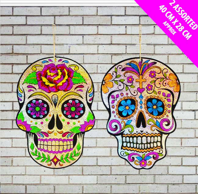 💀 Glitter skull hanging decorations with laser sparkle effect. Perfect for Day of the Dead celebrations and Halloween parties.