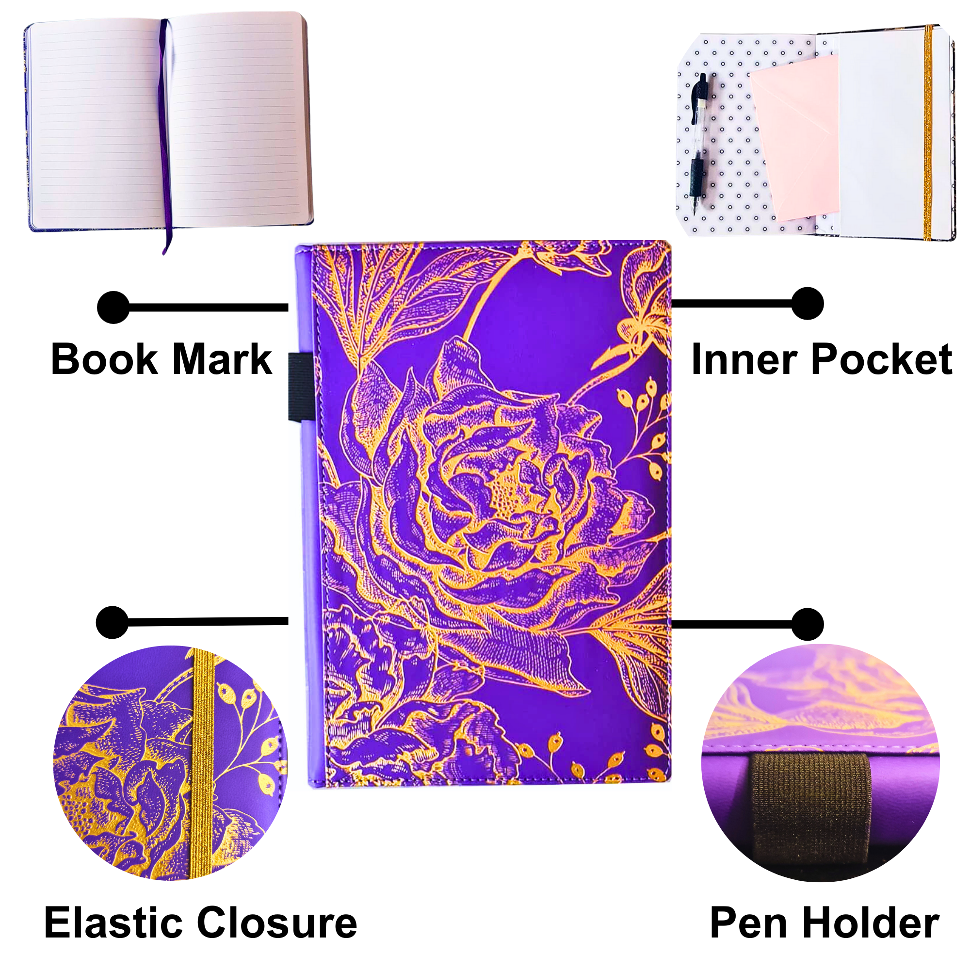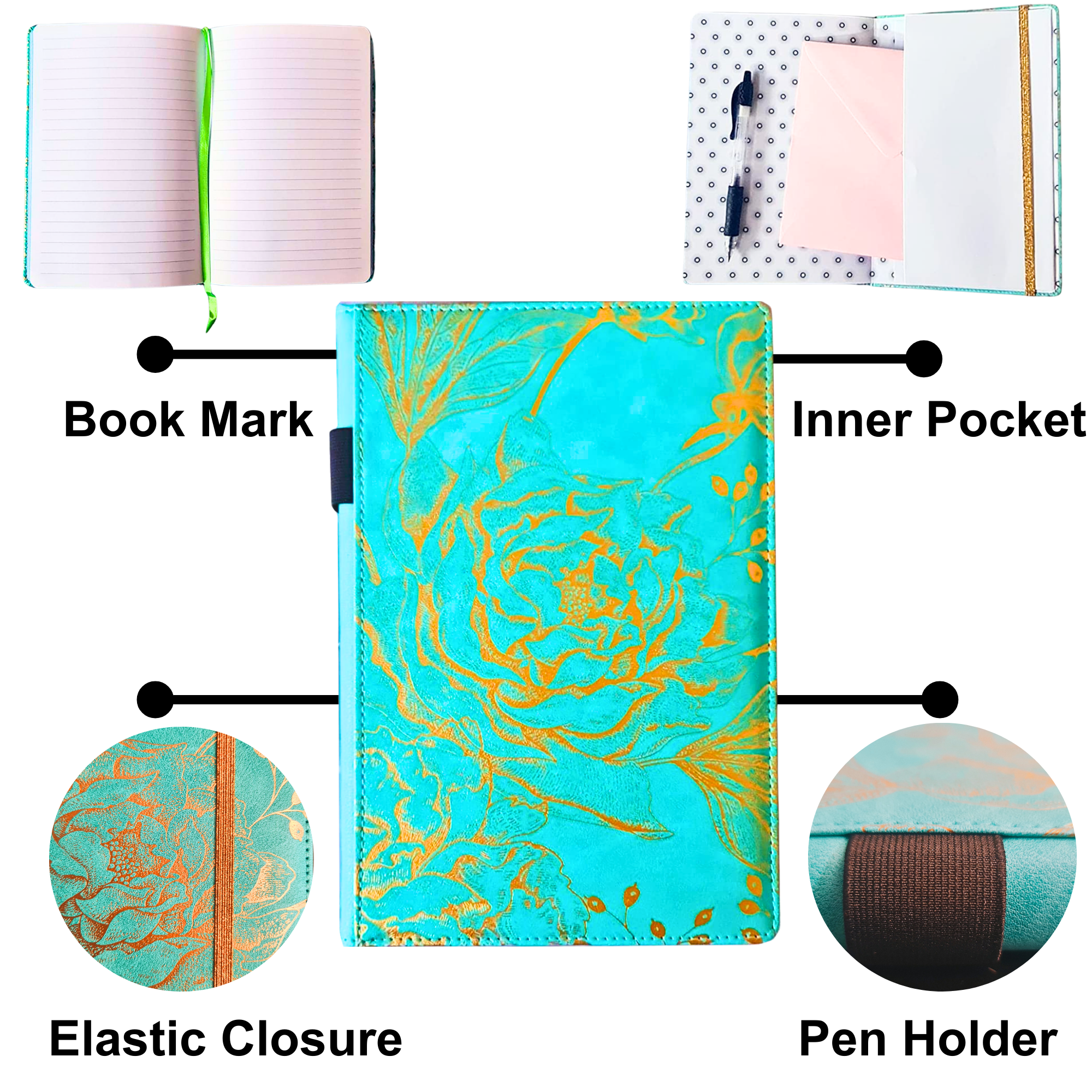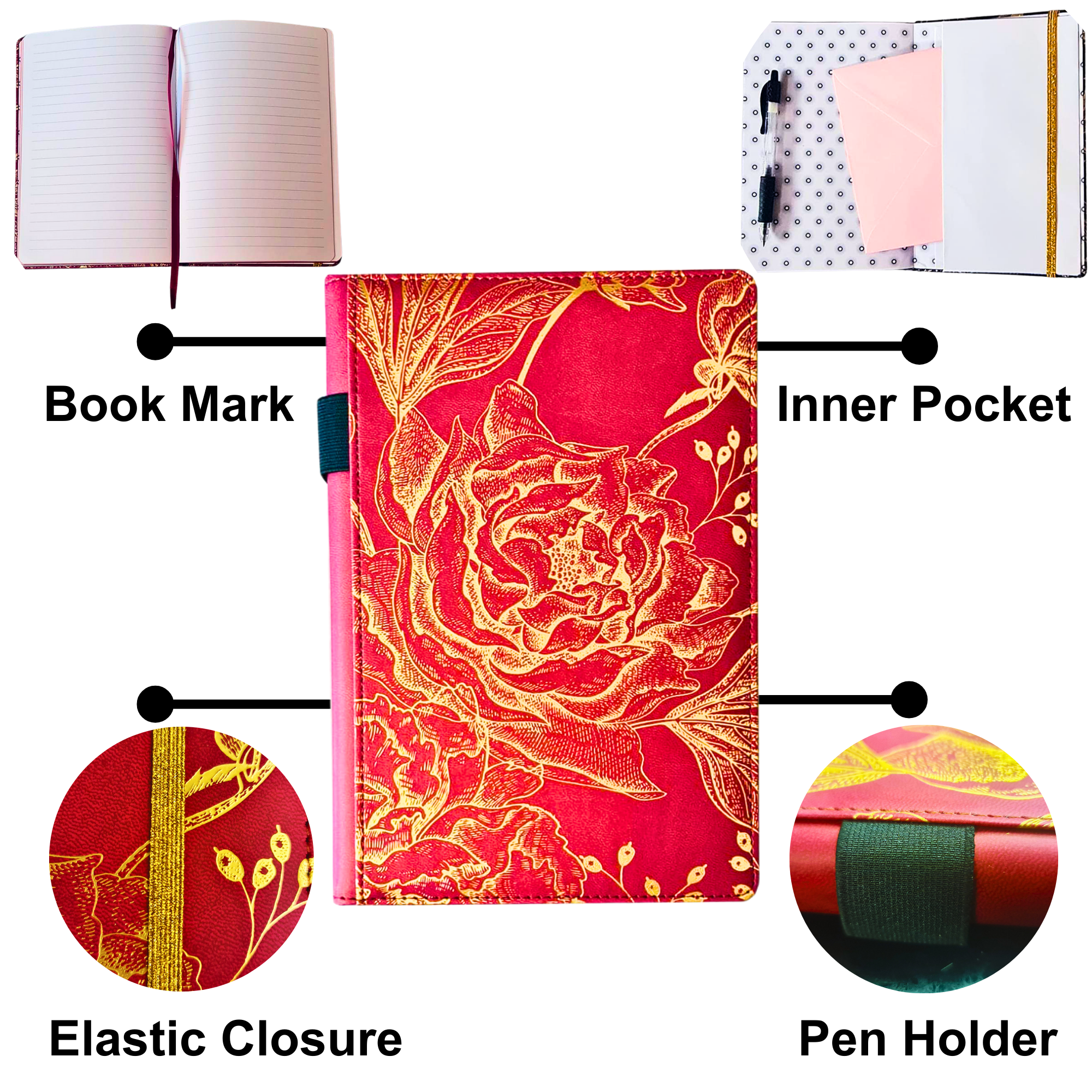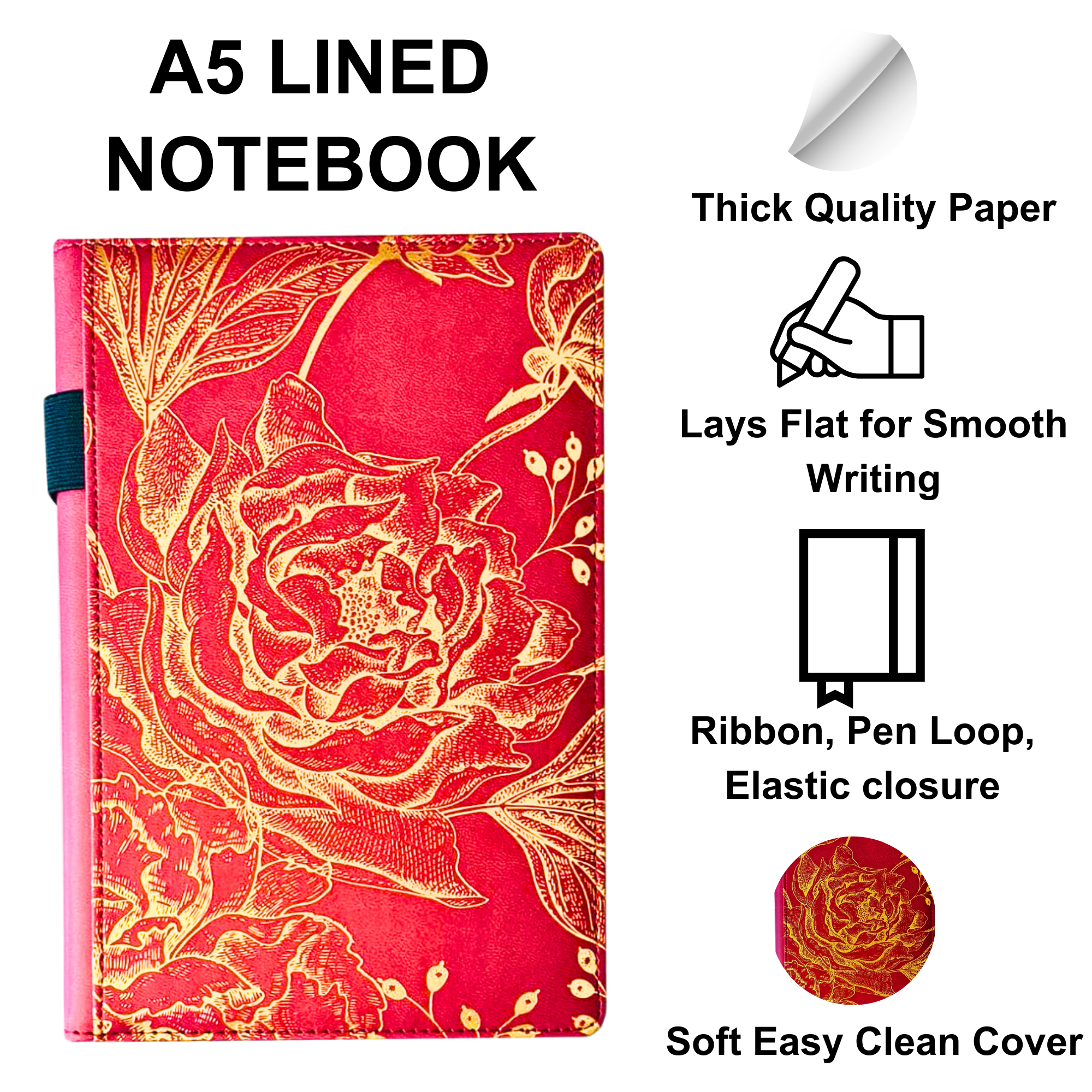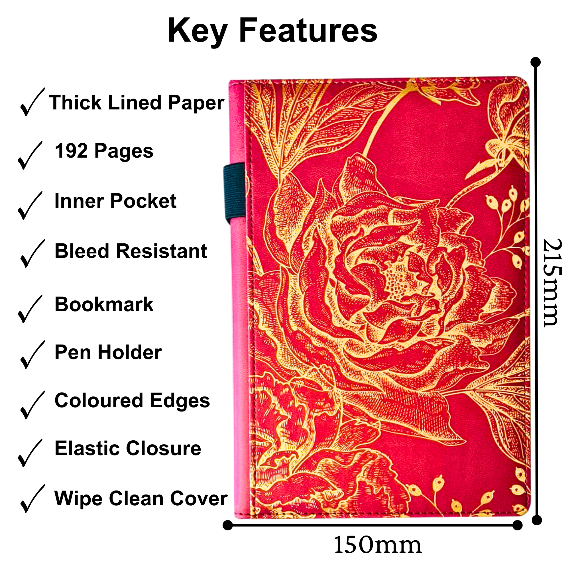 EJRange Notebook A5 Lined Journal - PU Leather, Wipe Clean Cover, Elastic Closure, Ribbon, Ruled, 192 Pages, Rose Design