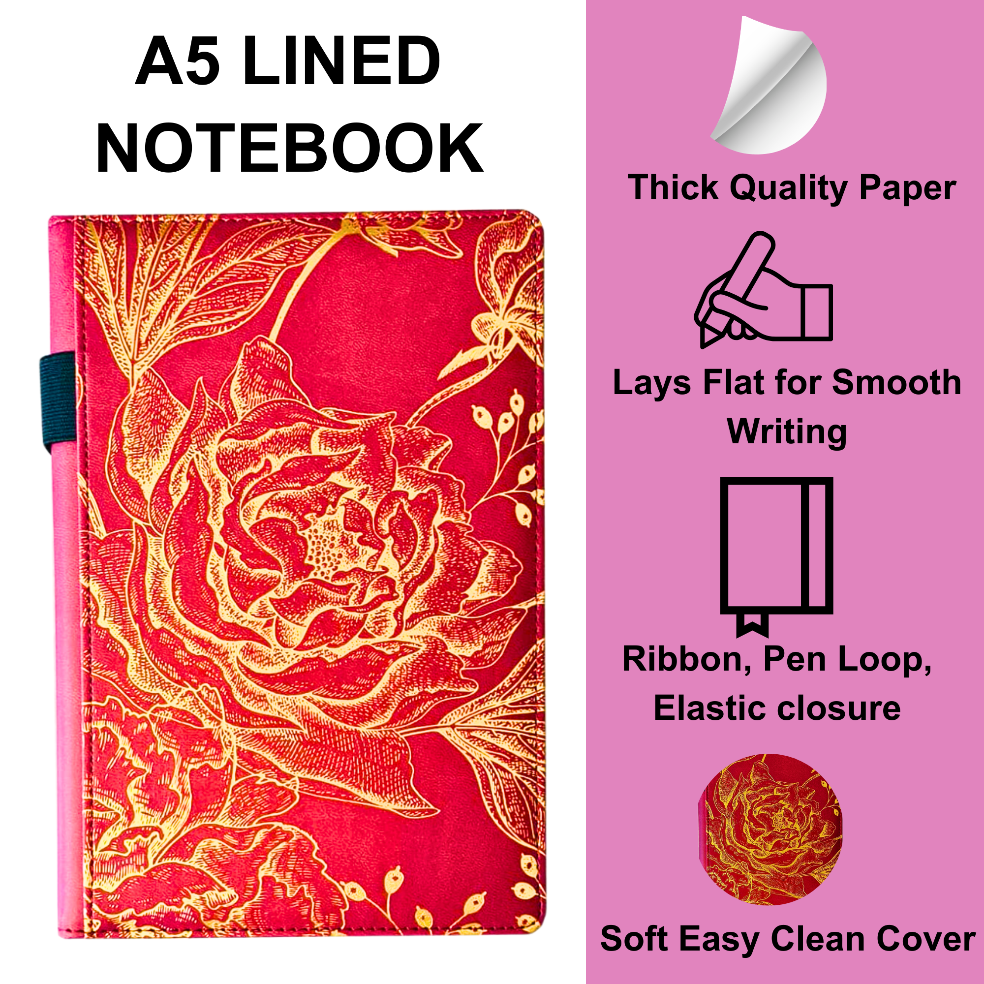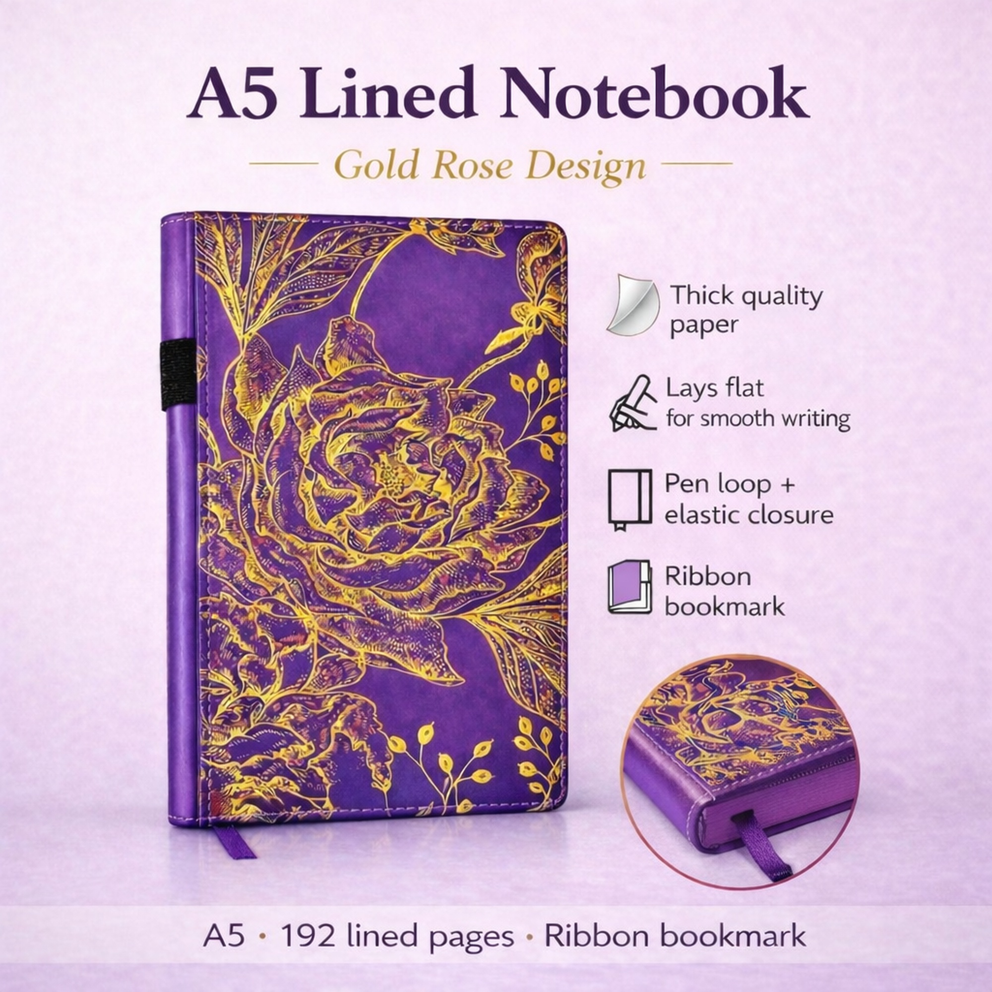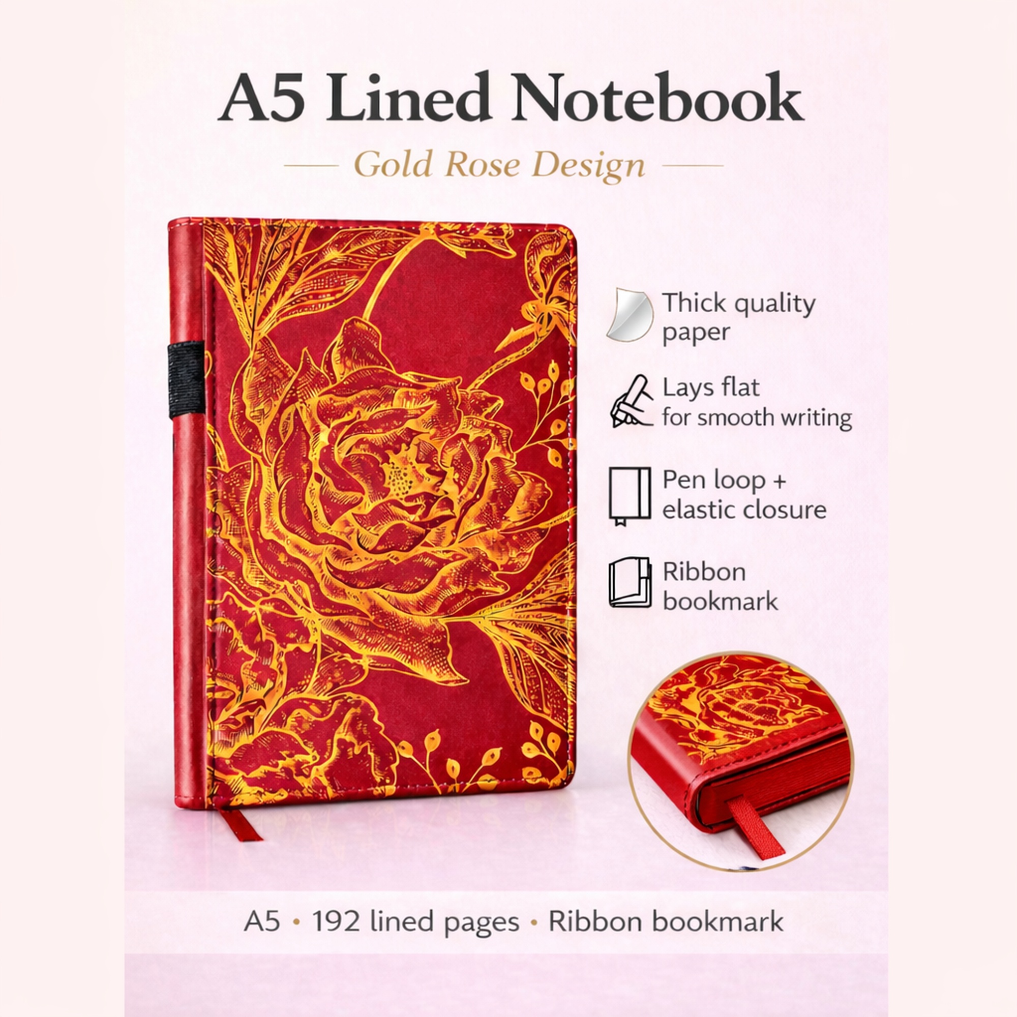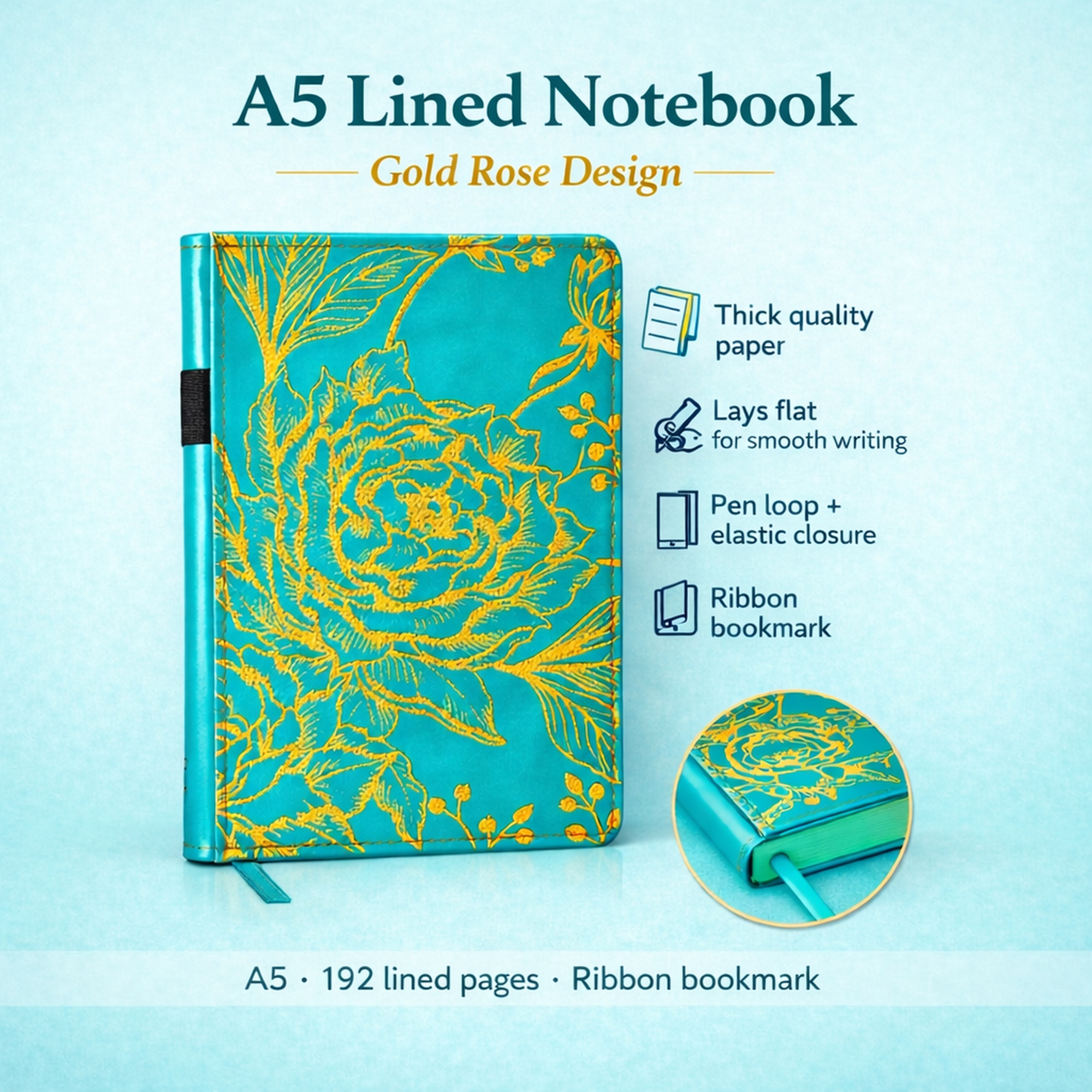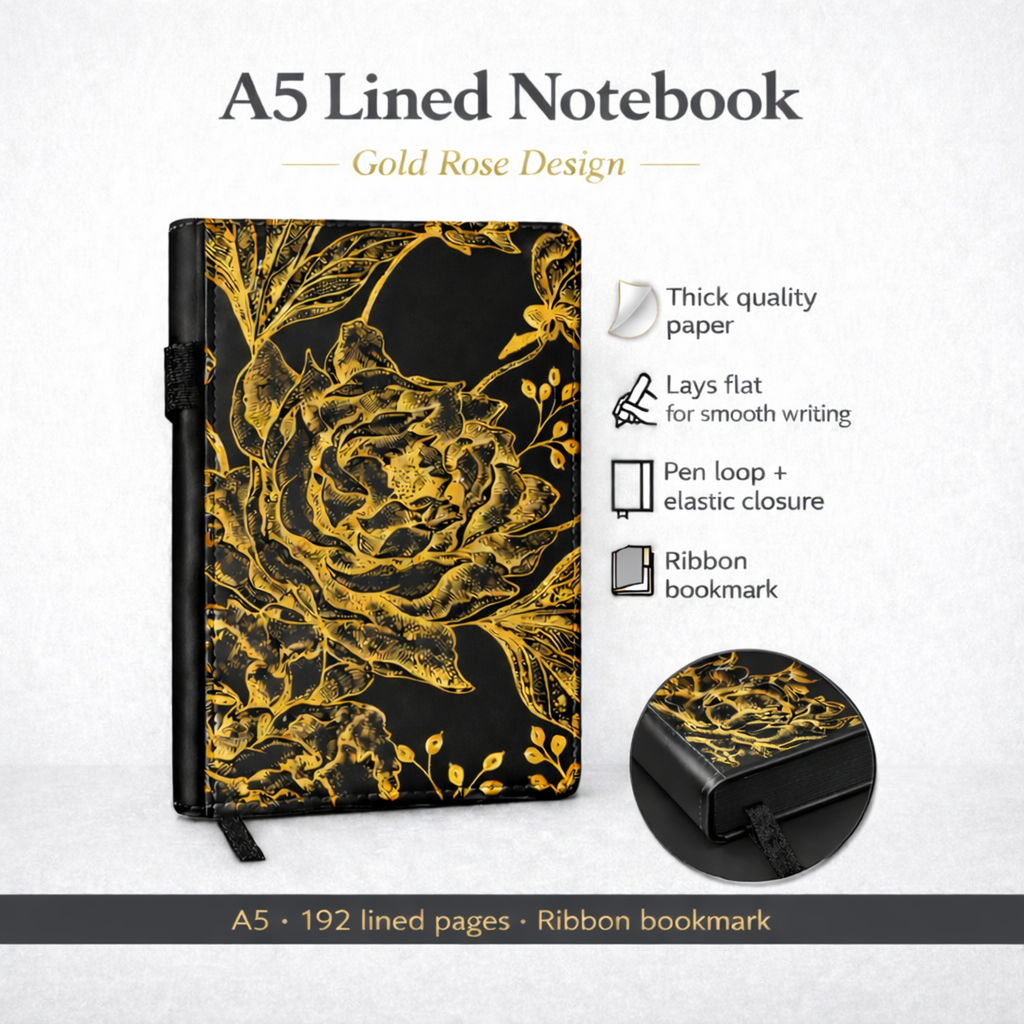 A5 Lined Notebook – Gold Foil Rose Design (Hardback)